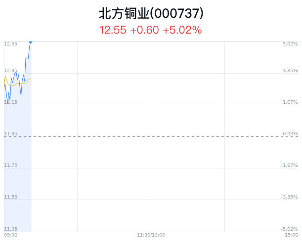 05月28日,北方铜业(000737)股价大幅上涨,截至09点51分,北方铜业上涨5.02%,报12.55元/股,成交5.96亿元,换手率6.67%。