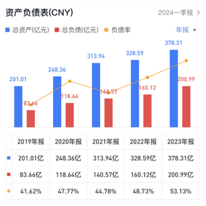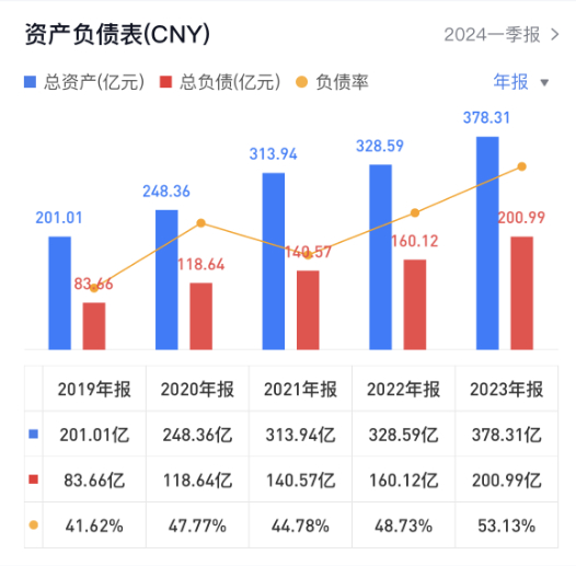 从负债表来看,2019年-2023年,科大讯飞总负债分别为83.66亿元、118.64亿元、140.57亿元、160.12亿元、200.99亿元;负债率分别为41.62%、47.77%、44.78%、48.73%、53.13%。
