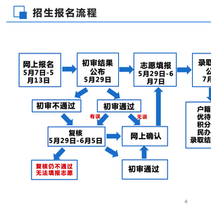 义务教育招生网上报名初审不通过或对初审结果、积分结果有异议的学生家长,可在5月29日9:30—6月5日17:30提出复核,复核通过后须在志愿填报时间结束前完成志愿填报。