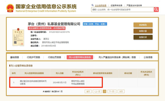 国家企业信用信息公示系统网站显示,茅台基金因通过登记的住所或者经营场所无法联系,于2024年5月21日被贵阳市观山湖区市场监督管理局列入经营异常名录。公司经营范围包括私募股权投资基金管理、创业投资基金管理服务;私募证券投资基金管理服务;以私募基金从事股权投资、投资管理、资产管理等活动;创业投资(限投资未上市企业);以自有资金从事投资活动;自有资金投资的资产管理服务;融资咨询服务;信息咨询服务(不含许可类信息咨询服务);企业管理咨询;企业管理。