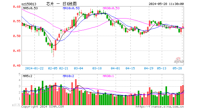 5月28日,截止午间收盘,半导体ETF(159813)涨0.95%,报0.531元,成交额1.71亿元。半导体ETF(159813)重仓股方面,北方华创截止午盘涨1.27%,中芯国际涨0.21%,韦尔股份跌0.70%,海光信息涨1.20%,中微公司涨2.37%,兆易创新涨1.44%,紫光国微涨0.98%,澜起科技涨0.10%,三安光电涨1.03%,长电科技涨1.15%。