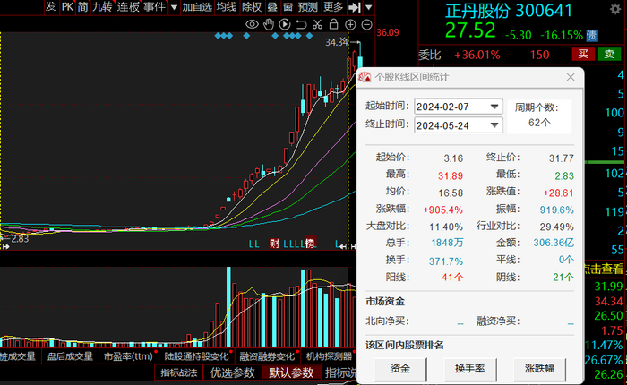 正丹股份在经历2月7日股价2.83元低点后一路攀升,2月7日-5月24日区间内累计涨超900%。