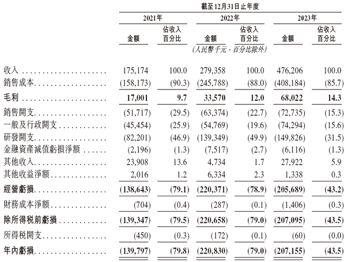 招股书显示,在过去的2021年、2022年和2023年,佑驾创新的营业收入分别为人民币1.75亿、2.79亿和4.76亿元,相应的净亏损分别为人民币1.40亿、2.21亿和2.07亿元,相应的经调整净亏损分别为人民币1.31亿、2.06亿和1.85亿元。