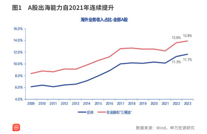 根据申万宏源证券的统计数据,2023年A股上市公司出海能力进一步提升,大公司出海能力相对更强。全部A股海外业务收入占比从2022年的11.3%提升0.4个百分点至11.7%,剔除金融和“三桶油”后的A股上市公司海外业务收入占比从13.6%提升0.3个百分点至13.9%。