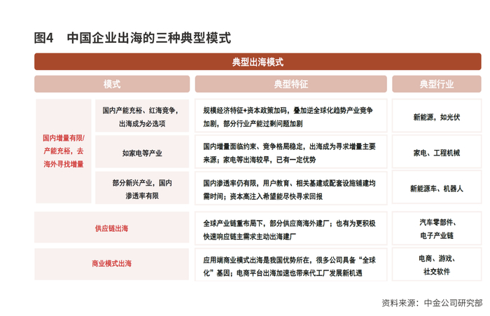 而从中国企业出海的具体模式来看,根据中金公司的总结,当前出海存在三种典型模式。
