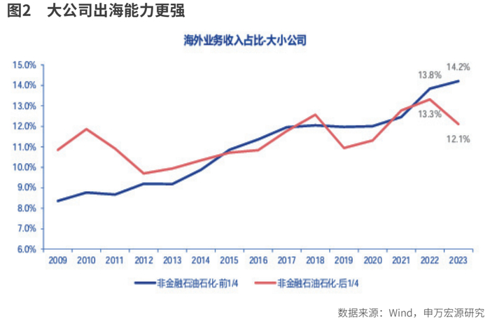 近年来A股大公司出海能力相对占优。以收入角度衡量,非金融石油石化A股收入排名前四分之一的公司海外业务收入占比从2022年的13.8%上升至2023年的14.2%,而收入排名后四分之一的公司海外业务收入占比从2022年的13.3%下降至2023年12.1%。