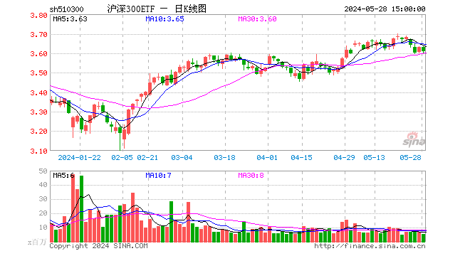 5月28日,华泰柏瑞沪深300ETF(510300)收盘跌0.63%,成交额19.24亿元。
