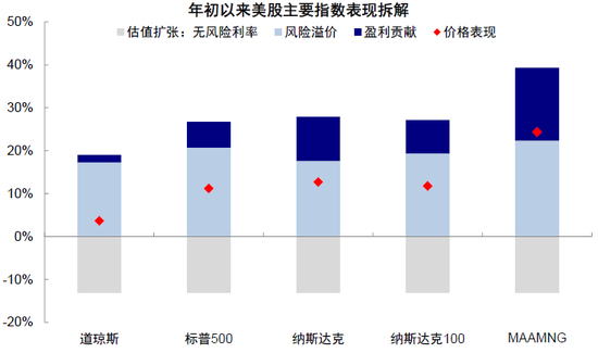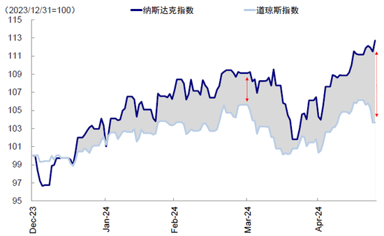 ► 科技周期同涨,市场风格扩散。一季度金融条件放松改善增长预期,再通胀交易情绪升温,带动铜金油等大宗商品价格上涨,提振了周期板块的表现,能源(13%)、金融(12%)、工业(11%)等与通讯服务(16%)和信息技术板块(12%)涨幅接近。二季度金融条件收紧压制增长预期,周期板块转为下跌,金融流动性收紧同样使得科技股面临压力,信息技术和通讯服务等科技板块涨幅明显收窄。但随后在利率下行和科技龙头股业绩催化下,纳斯达克指数相对道琼斯指数的超额收益再度扩大(由3月底的3.5%升至9%)。