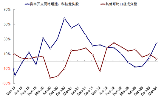 资本开支增加也体现需求旺盛。持续旺盛的需求也体现在资本开支的增加上。一季度标普500指数非金融可比口径成分股整体资本开支规模回落,由去年四季度的2710亿美元降至2337亿美元,其中医疗保健板块降幅最大。然而,科技龙头资本开支规模由不降反升,由四季度的480亿美元升至490亿美元,同比增速大幅抬升至25%。Meta上调全年资本开支指引至350-400亿美元(此前为300-370亿美元)以建设数据中心等设施;谷歌预计2024年全年季度资本开支均将维持在不低于一季度的120亿美元,主要用于AI和大模型基础建设投资;微软预期下季度资本开支将环比大幅提升,用于算力建设等。