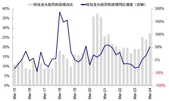 图表:科技龙头股一季度回购规模环比增加17%至550亿美元,占标普500指数可比口径回购规模的27%