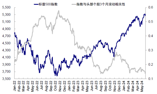 ► 整体集中度下降,但科技股头部集中反而强化。整体来看,标普500指数整体头部集中度有所下降,从指数与头部个股的3个月滚动相关性来看,该指标年初以来持续下行,近期维持在0.14左右的低位,但这个更多是得益于风格间的扩散。如果看科技股内部,头部集中度反而增强。MAAMNNG年初以来的表现中,英伟达一支独秀涨幅高达115%,而其他个股涨幅在20~30%间,苹果甚至下跌1%,因此科技龙头股的走势更多取决于英伟达的表现。