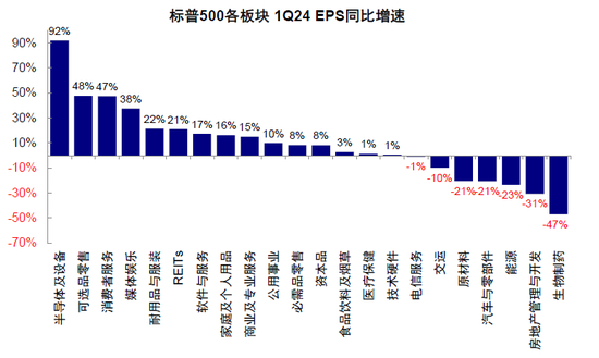 图表:一季度半导体及设备、可选品零售和消费者服务等EPS增速领先,生物制药、房地产管理开发等落后