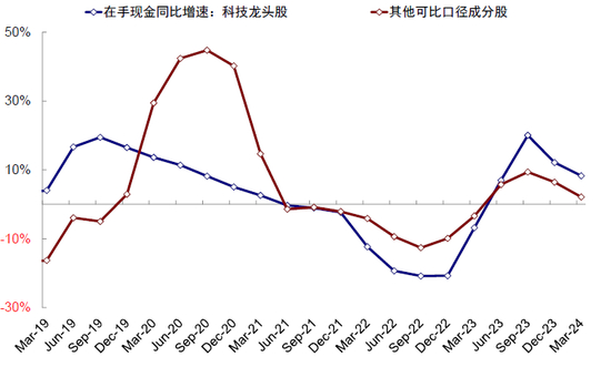 图表:科技龙头股在手现金规模同比增速仍维持在8%左右,显著高于其他可比口径成分股的2%