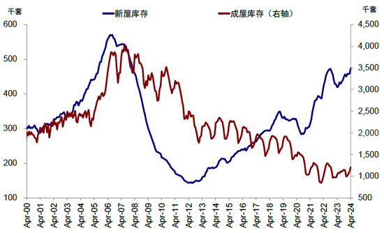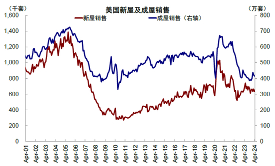 周期股涨的是预期而非盈利本身。如上文所述,周期板块年初以来的涨幅更多依赖于风险溢价的走低而带来的估值扩张,盈利尚未出现明显改善,这也不难解释金融条件收紧后周期板块快速下行。具体来看,能源、工业与原材料等周期板块一季度盈利仍较为疲弱,仅金融板块有所改善,但主要是得益于投行和交易业务的收入增加,传统商业银行业务仍受到信贷成本拖累。此外,地产需求一季度边际改善,地产当前处于周期磨底阶段已经超过两年,同时成屋库存也处于低位,因此按揭利率的放松对投资回报率与融资成本“基本持平”的地产需求边际影响较大(《降息交易的钟摆与“终局”》)。一季度住宅建筑板块盈利整体改善,霍顿房屋表示将继续维持充足的库存以应对居民的购房需求,普尔特房屋预计当前地产市场仍存在超过百万套的结构性短缺,库存的结构性短缺或将有利于新房的销售。