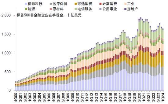 图表:标普500非金融在手现金从去年四季度的1.70万亿美元回落至今年一季度的1.65万亿美元