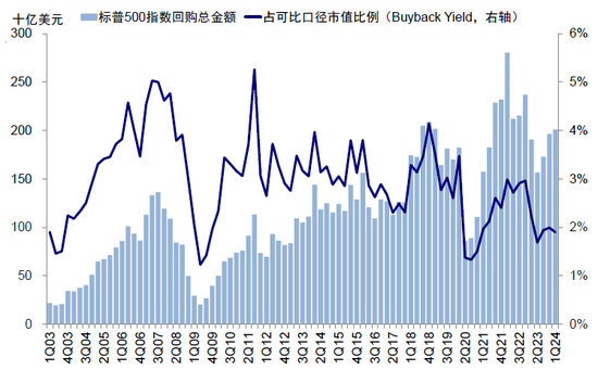 图表:标普500指数已披露的一季度回购金额较去年四季度有所抬升,市值占比略微下降至1.9%