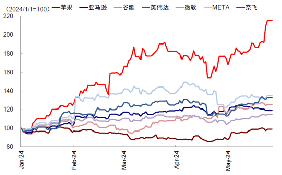 图表:英伟达年初以来涨幅高达115%,而其他成分股涨幅在20~30%间,苹果甚至下跌1%
