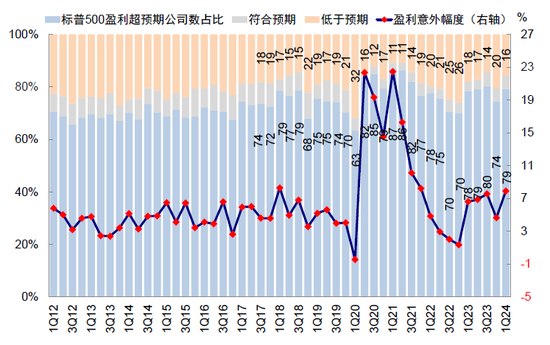 图表:一季度标普500盈利超预期幅度抬升至7.9%,超预期公司数占比同样抬升至79%