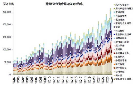 图表:一季度软件服务资本开支规模抬升明显,生物制药、电信服务、公用事业等较四季度回落