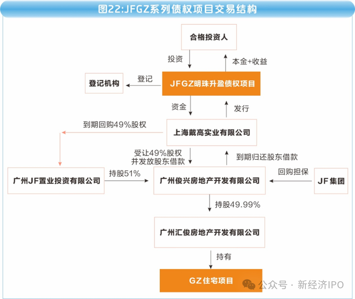 该系列债权项目的发行人为上海戴高实业,产品数量5只,总规模12.5亿元。资金用途为,受让广州俊发置业投资有限公司(下称“广州俊发”)持有的广州俊兴房地产开发有限公司(下称“广州俊兴”)49%股权以及向广州俊兴提供股东借款,资金最终用于广州俊兴持股公司广州汇俊房地产开发有限公司(下称“广州汇俊”)持有的广州市增城区旧村改造项目开发支出(图22)。