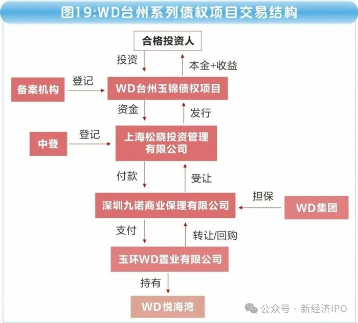 该系列债权项目的发行人为上海松晓投资,产品数量5只,总规模12.5亿元。资金用途为,受让玉环万达置业有限公司(下称“玉环万达”)销售万达悦海湾项目形成的应收尾款。产品交易结构显示,投资人的投资款进入上海松晓投资,之后资金流向九诺商业保理,再由九诺商业保理向玉环万达提供融资(图19)。
