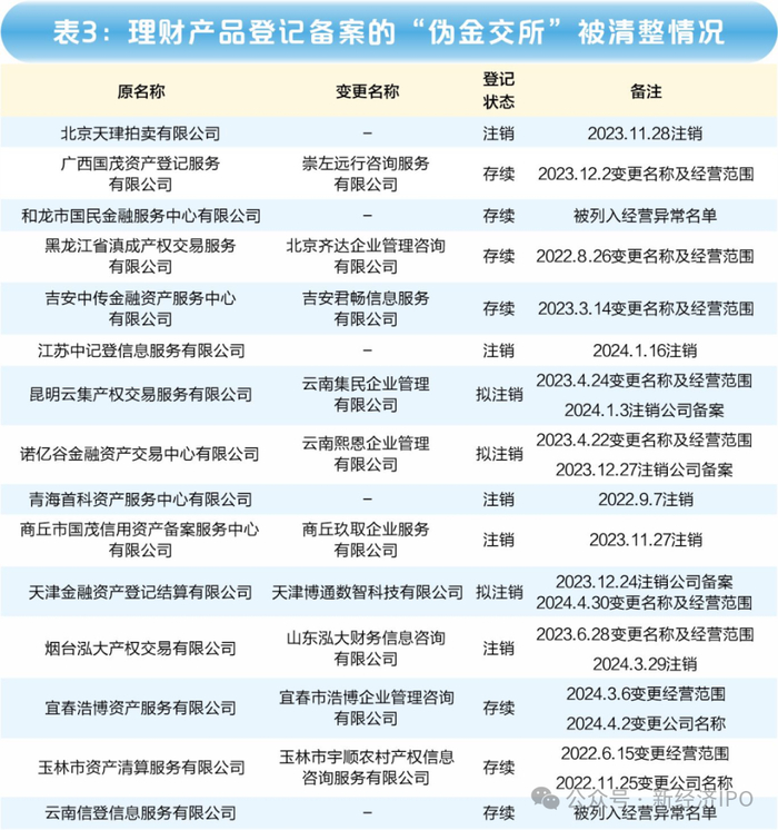 根据记者的汇总统计,海银财富所销售的理财产品,涉及的“伪金交所”共计15家,经查证,其中绝大部分都已经被清理整顿(表3)。