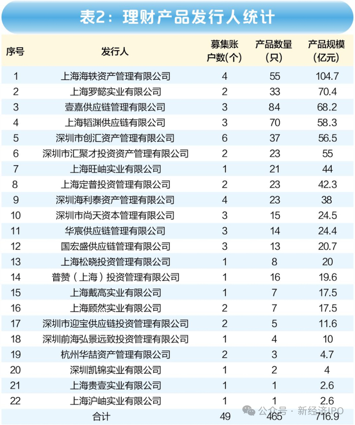 其中,发行规模排名前三的是上海海轶资产管理有限公司(下称“海轶资产管理”)、上海罗懿实业有限公司(下称“罗懿实业”)、壹嘉供应链管理有限公司(下称“壹嘉供应链”),发行规模分别为104.7亿元(55只产品)、70.4亿元(33只产品)、68.2亿元(84只产品)。其他多数发行人的募资规模也都在10亿元以上。