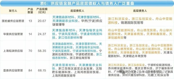 记者追踪发现,不同发行人所发行的产品,其底层资产涉及的债权人与债务人呈现出大面积重叠的特征。比如,“天津施淼新材料”“宁波风笙商贸”等公司,反复出现在底层债权人名单中;“浙江科沃实业”“舟山德茂贸易”等公司,则屡次现身于底层债务人名单(表6)。