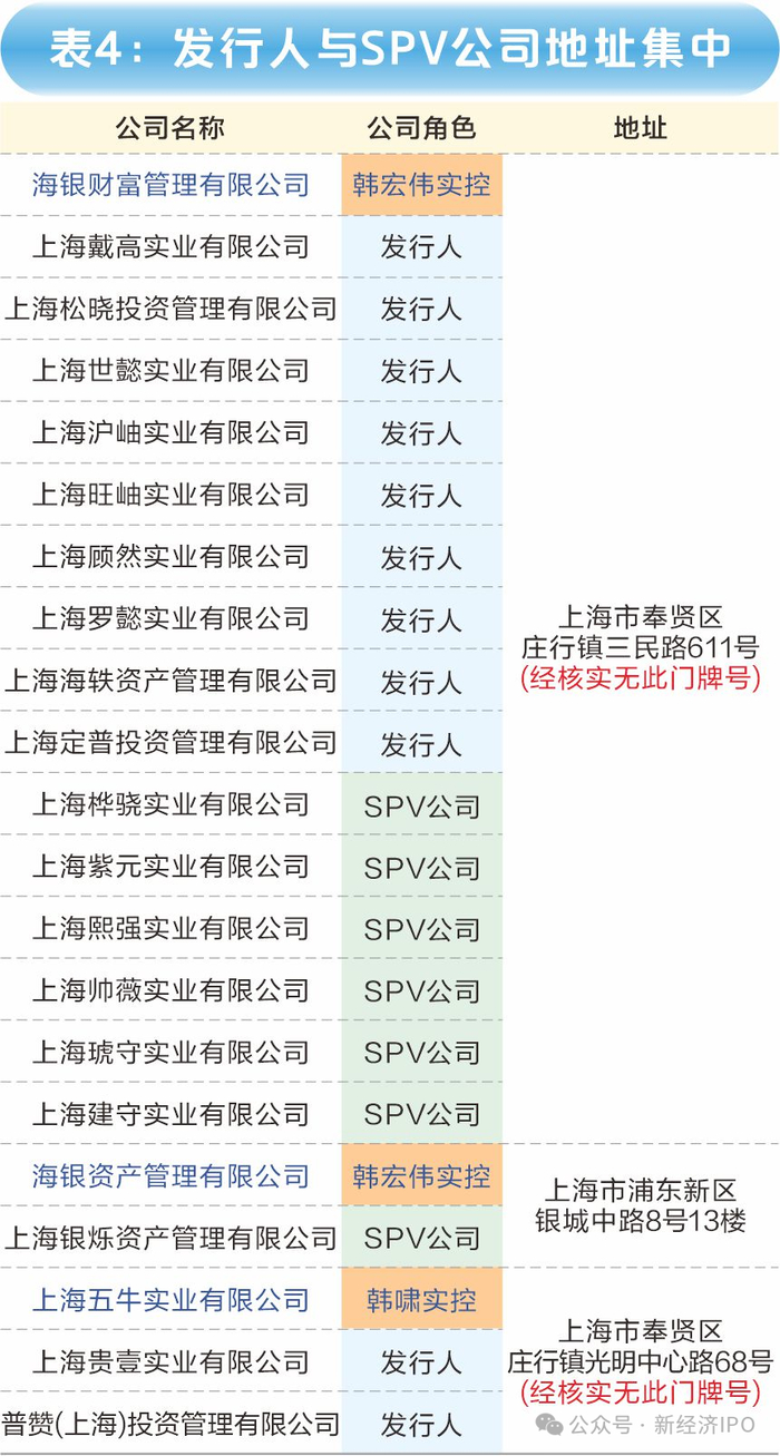 这批公司的一个最大特点是,它们注册地很集中,却找不到有实际办公者。比如,“上海市奉贤区庄行镇三民路611号”这个地址,有9家发行人及6家SPV公司皆注册于此,并且与海银财富的注册地址相同(表4)。
