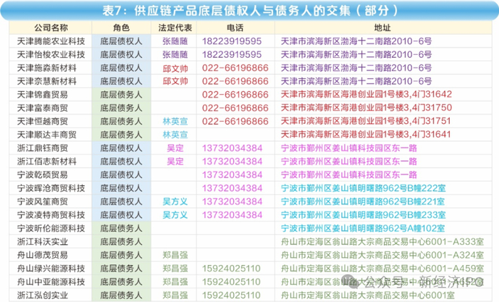 记者进一步追踪了出现频率较高的20家底层债权人与债务人,它们主要位于天津、宁波、舟山等城市。这些公司看上去各自股权独立,却有着多重的关联与交集,诸如相同的注册地址、相同的联系电话、相同的法定代表人(表7)。