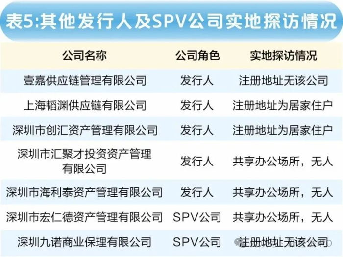 除了上海之外,记者还寻访了注册于山东烟台、广东深圳的多家发行人及SPV公司,皆未找到有实际办公者。它们或者是注册地址无对应公司,或者是位于共享办公场所无人办公,有的甚至是假冒居民的居家地址(表5)。