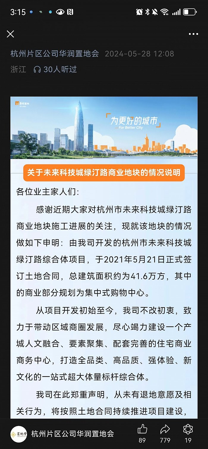5月28日,华润置地通过微信公号“杭州片区公司华润置地会”公开回应其杭州市未来科技城绿汀路商业地块“退地”传闻,称“从未有退地意愿及相关行为,将按照土地合同持续推进项目建设,直至项目商业顺利开业”。