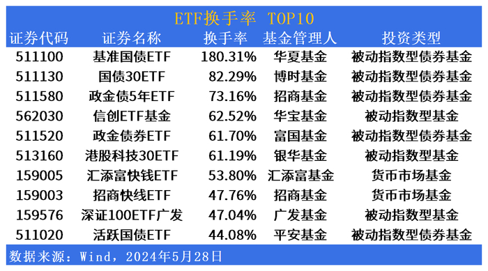 换手率TOP10方面,华宝信创ETF基金(562030)换手率仍居市场前列,银华港股科技30ETF(513160)紧随其后。汇添富快钱ETF(159005)、招商快线ETF(159003)进入换手率前十。