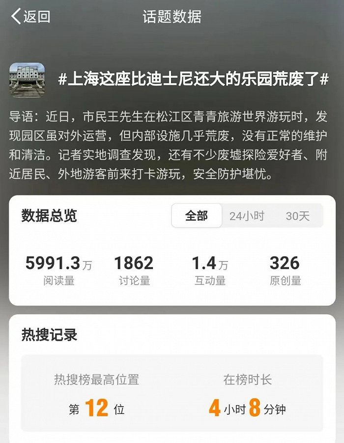 近日,一则关于#上海这座比迪士尼还大的乐园荒废了#的热搜引发了广泛的关注与讨论,也让已沉寂多年的上海松江青青旅游世界再次回到大众视野。