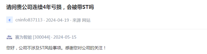 另外,面对赛为智能的持续亏损,有投资者提出质疑“请问贵公司连续4年亏损,会被带ST吗”。
