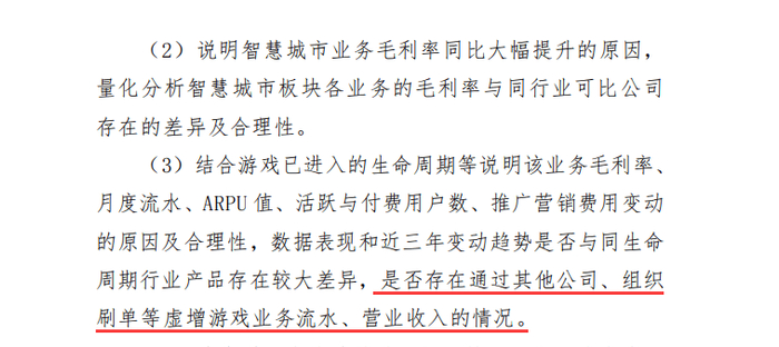 同时,深交所要求赛为智能“结合游戏已进入的生命周期等说明该业务毛利率、月度流水、ARPU 值、活跃与付费用户数、推广营销费用变动的原因及合理性,数据表现和近三年变动趋势是否与同生命周期行业产品存在较大差异,是否存在通过其他公司、组织刷单等虚增游戏业务流水、营业收入的情况。”
