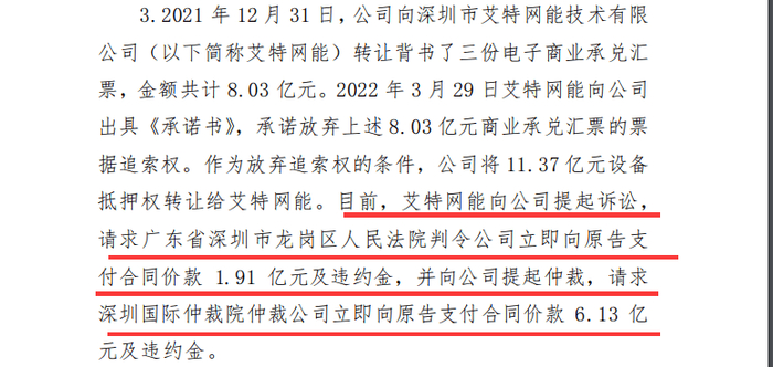 2022 年 3 月 29 日艾特网能向公司出具《承诺书》,承诺放弃上述 8.03 亿元商业承兑汇票的票据追索权。作为放弃追索权的条件,赛为智能将 11.37 亿元设备抵押权转让给艾特网能。