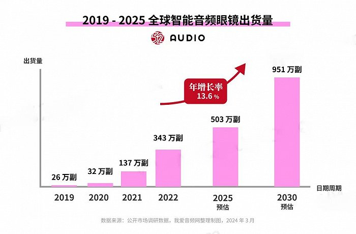 Ray-Ban Meta被称为AI眼镜是在其Meta AI功能上线后的事情,而在这之前大家称它为智能眼镜或是智能音频眼镜。据公开市场调研数据,2022 年,全球智能音频眼镜市场出货量达343万副,公开市场调研数据预测,预计到2025年,全球音频眼镜市场出货量将超过 503万副,2030年将达951万副。