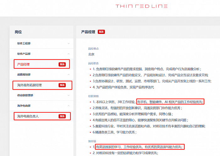 另外在罗永浩的XR公司细红线招聘页面显示,紧急招聘服务端研发工程师、AI研发工程师、Android框架工程师、产品经理。其中产品经理的职位要求为有手机、智能硬件、AI 相关产品的工作经验优先,而在战略规划部和海外电商部的职位同样标为紧急招聘。或许,罗永浩的AI眼镜将会主要针对海外市场,抑或是放眼全球市场来实现首个产品的开门红。