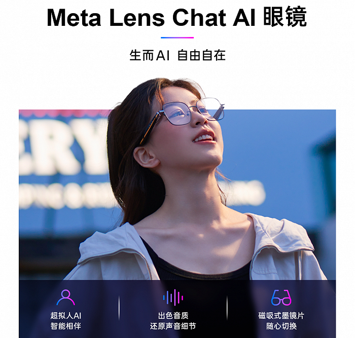 不同于华为的保守,李未可近日推出的Meta Lens Chat就被定义为首款AI眼镜。据悉,这款眼镜主打AI语音交互能力,用户可使用语音交互让AI成为私人助理。