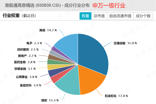 与港股通高股息指数不同的是,精选指数第一大行业是交通运输,占比达到31%,其次是石油石化(17.8%)、煤炭(15.3%),三者合计占比达64%。