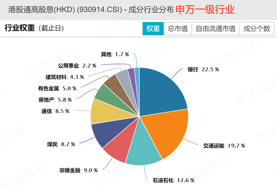 成分股中第一大行业为银行,占比22.5%,其次是交通运输(19.7%)、石油石化(12.6%),三者合计权重占比为54.8%,前十大权重股合计占比为50%。