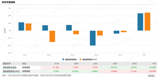 历年业绩表现中,更纯粹的港股通高股息指数在近三年表现更优,今年来两指数涨幅均在24%上下。