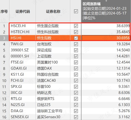 Choice数据显示,恒生指数、恒生科技、恒生国企等指数自1月22日触底来,累计反弹幅度均在30%以上,显著跑赢全球主要指数。