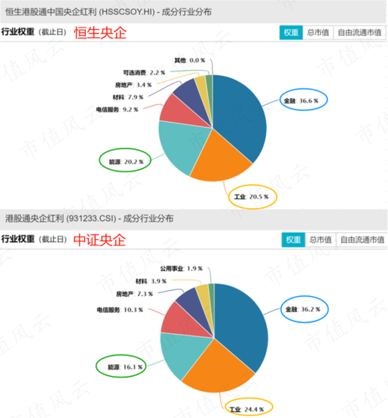 恒生央企和中证央企行业分布基本大同小异,金融、工业以及能源权重占比近八成,但中证央企在工业和房地产上占比更高。