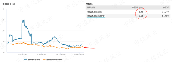 若从估值水平来看,港股通高股息指数估值相对更低,精选指数估值经过这几年的消化,目前为8.5倍,处于历史37%分位点。