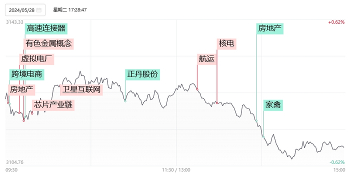 财联社5月28日讯,今日28股涨停,15股炸板,封板率为65%,众智科技20CM3连板,郴电国际、博通集成、大连热电3连板,扬帆新材20CM2连板,双象股份、神马电力、华钰矿业2连板,芯能科技、麦趣尔、明星电力、西昌电力3天2板。总体上个股跌多涨少,全市场超4100家个股下跌。沪深两市今日成交额7417亿,较上个交易日缩量331亿。板块方面,电力、智能电网、商业航天、小金属等板块涨幅居前,高速连接器、房地产、文化传媒、跨境电商等板块跌幅居前。截至收盘,沪指跌0.46%,深成指跌1.23%,创业板指跌1.35%。