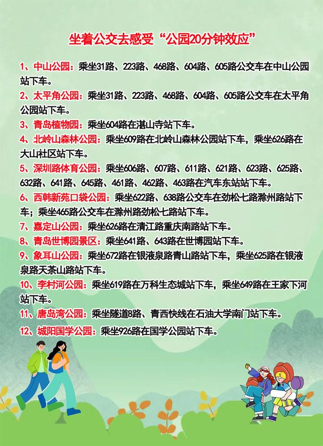 时下,有关“公园20分钟效应”的说法在社交媒体走红。这是指每天到公园或其他能接触大自然的地方待上20分钟,即使不做任何运动,也能让人感到更加快乐和放松。5月28日,城运控股交运温馨巴士公司制作了逛公园乘车攻略,为市民奉上青岛市部分公园的乘车线路,快乘坐温馨巴士去试试“公园20分钟效应”吧!