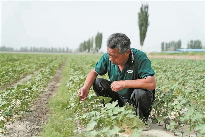 5月的南疆,正是棉花田管的农忙时节,在三师四十九团七连棉花种植户闫建峰的棉田里,一株株嫩绿的棉苗长势喜人。由于采用“干播湿出”滴水出苗技术,他家棉花今年的播种时间提前近一周,目前,棉苗均匀、壮实,达到田管标准。