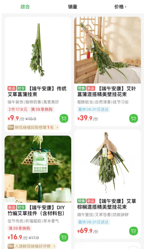 普通款的艾草菖蒲挂束最低只要9.9元,配饰更精致的则要贵一些,其中加了香囊的要39.9元、加了葫芦、棕榈等元素的则要69.9元,不过两个复杂款式目前是预售的状态,最快6月1日才能配送。